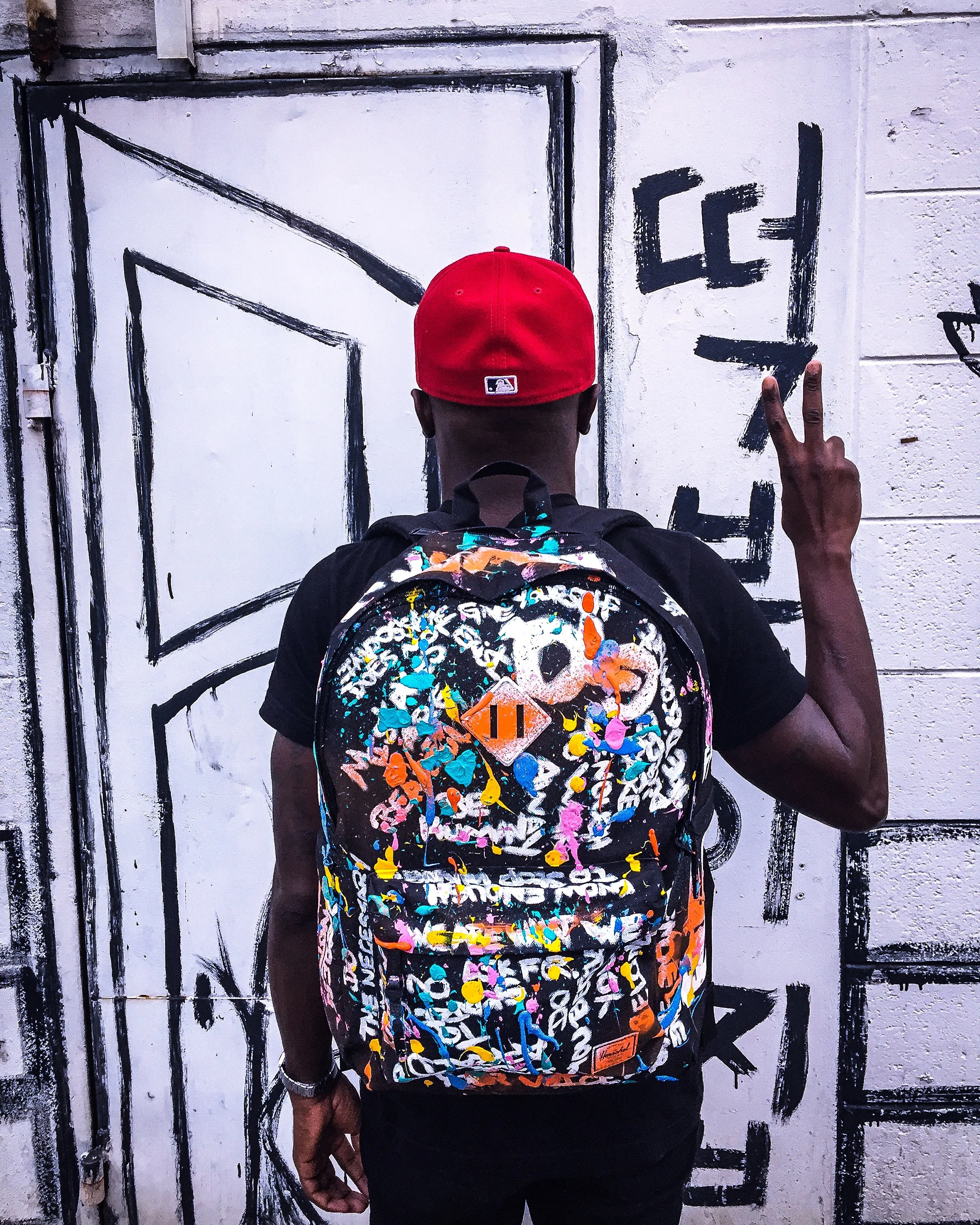 "Colliding Words" Mixed media on Herschel Supply Co. Backpack Canvas is the first piece of my ongoing traveling installation. Each piece of art created for upcoming travels will create an overall collection.